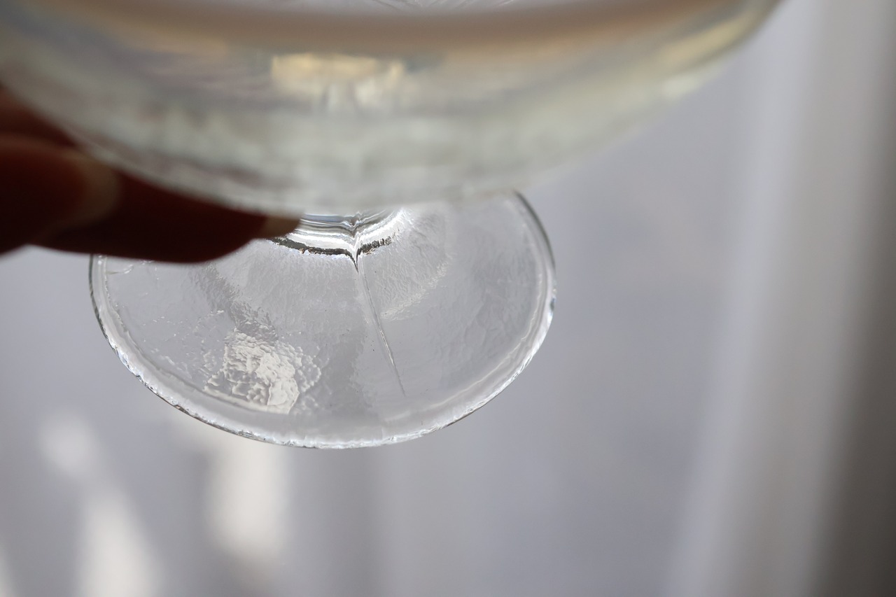 明治~昭和にかけてのプレスガラスなので、足元やカップの側面部分などに筋が入っています
