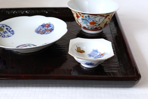 裏の文様は宝尽くしの巻物文が描かれています。お祝いの席に使われたものだと思います。