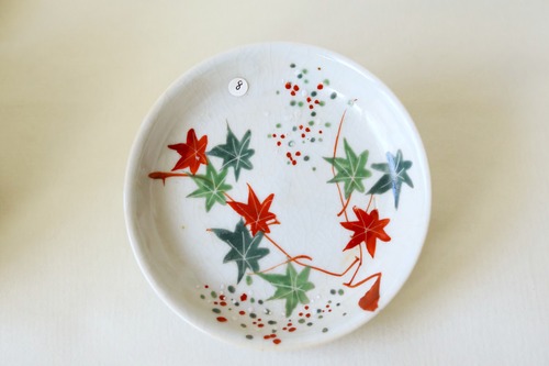 白釉素地に細やかな貫入が入り、そこに赤・緑の絵付けで紅葉が描かれています。