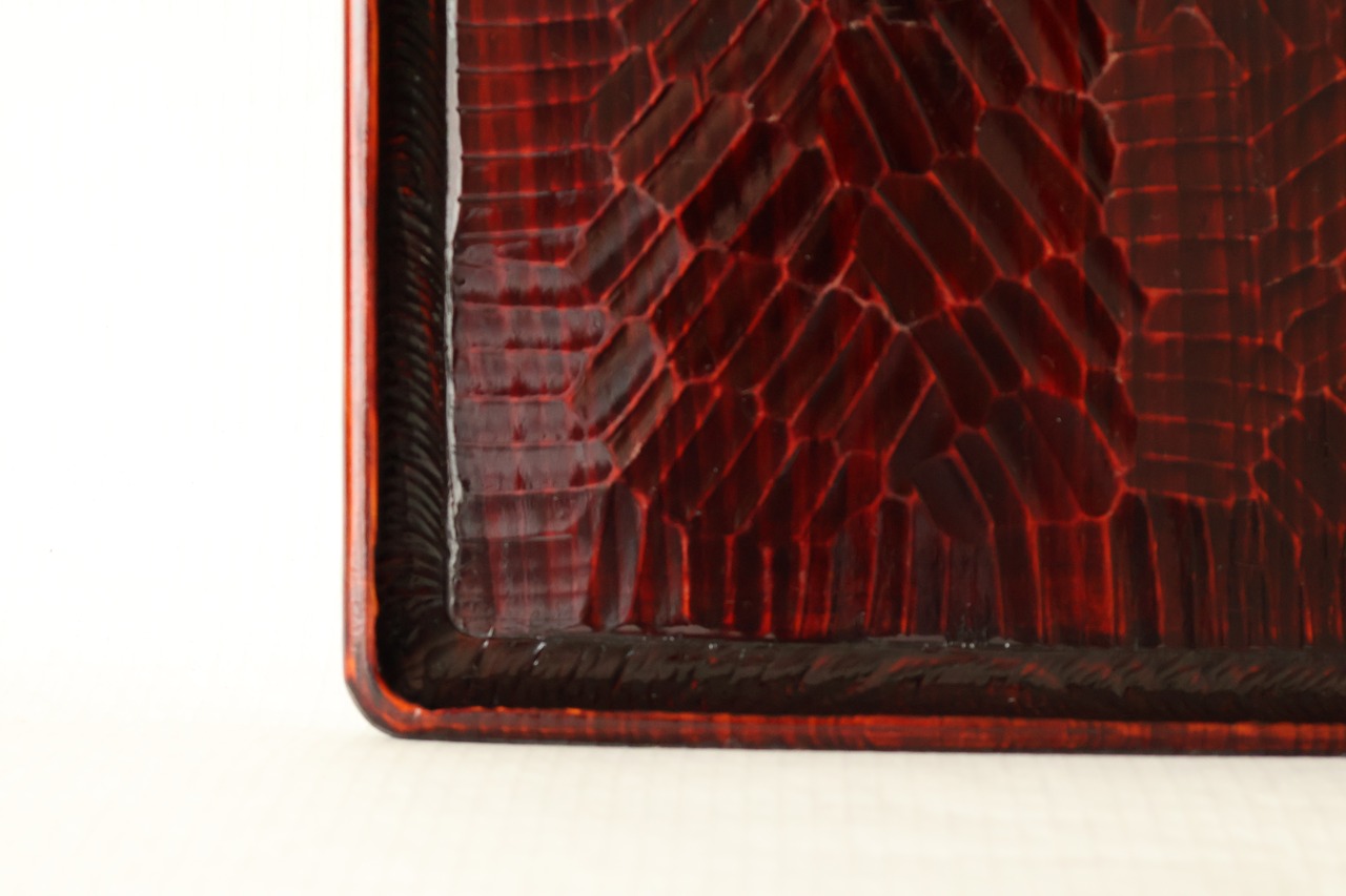 漆を塗り重ねて彫り込まれています。色漆の層が彫り下がることで現れる模様と、